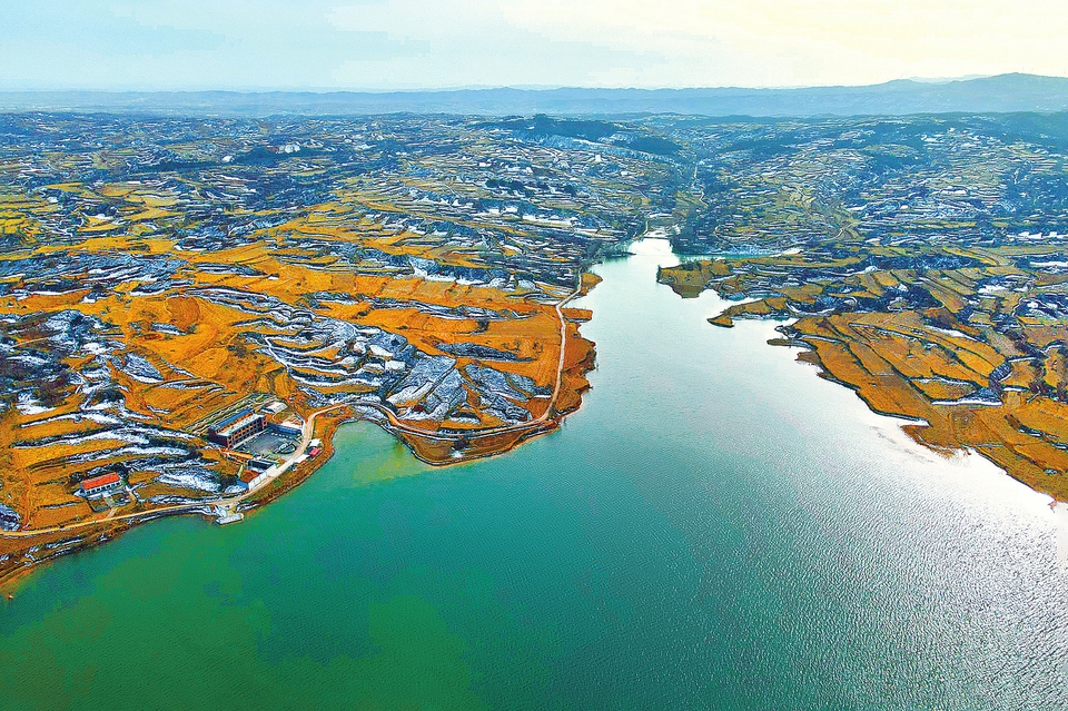 12月21日,俯瞰长治市屯留区屯绛水库,水面波光粼粼,与蓝天、黄土相映,绘就冬日生态画卷。近年来,当地持续加强生态保护修复,推进“调水、控污、清淤、畅通、扩绿、增长”,为群众营造了舒适宜人的生态家园。记者 杨晨玉 摄