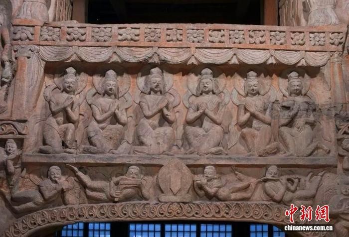 云冈石窟第7窟后室南壁明窗与窟门之间供养天人像,俗称“云冈六美人”。 (资料图,云冈研究院供图)