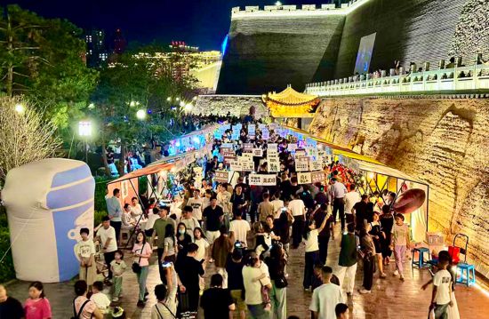 初夏之夜,山西临汾古城墙角楼下灯火璀璨,人潮涌动,“亚洲,一起飞·向未来”咖啡集市成为市民和游客夜间休闲打卡的新地标。